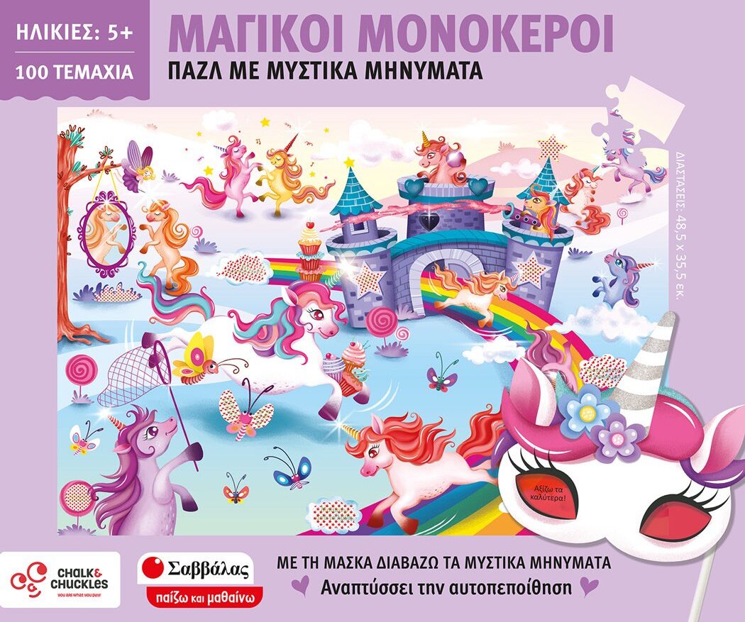 Συναρμολόγησε τα 100 κομμάτια του παζλ. Χρησιμοποίησε τη μαγική μάσκα και διάβασε τα μυστικά μηνύματα από το βασίλειο των μονόκερων.