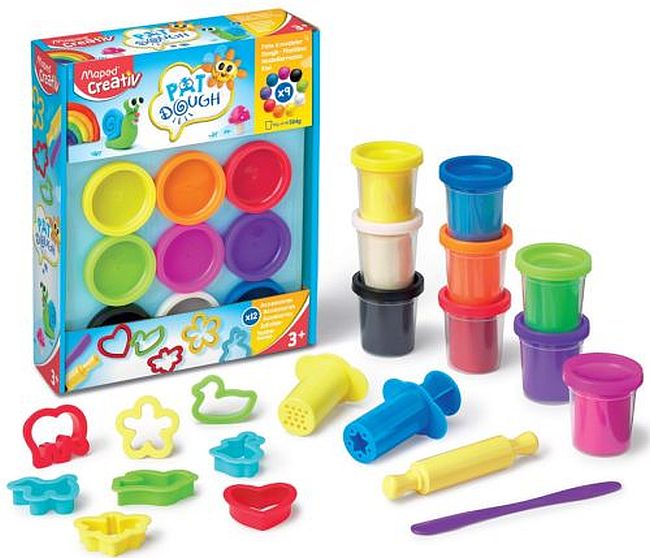 Σετ με πλαστοζυμαράκια Maped σε 9 διαφορετικά χρώματα (9 x 56gr) και 12 αξεσουάρ. Τα πλαστοζυμαράκια έχουν λεία υφή, δεν κολλάνε και αποθηκεύονται σε διάφανα βαζάκια.